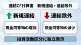 | 新規連結による現金増加 | 取得対価と子会社現金の差額を計上 | 投資活動 |