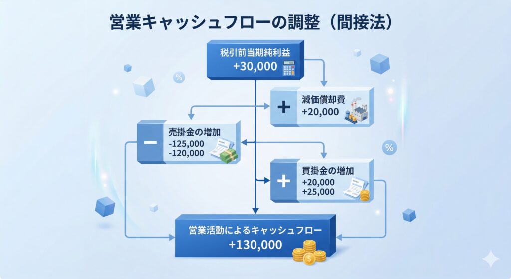 - 非現金項目の調整: 減価償却費、のれん償却額、貸倒引当金の増減など、現金の流出入を伴わない損益を調整します。