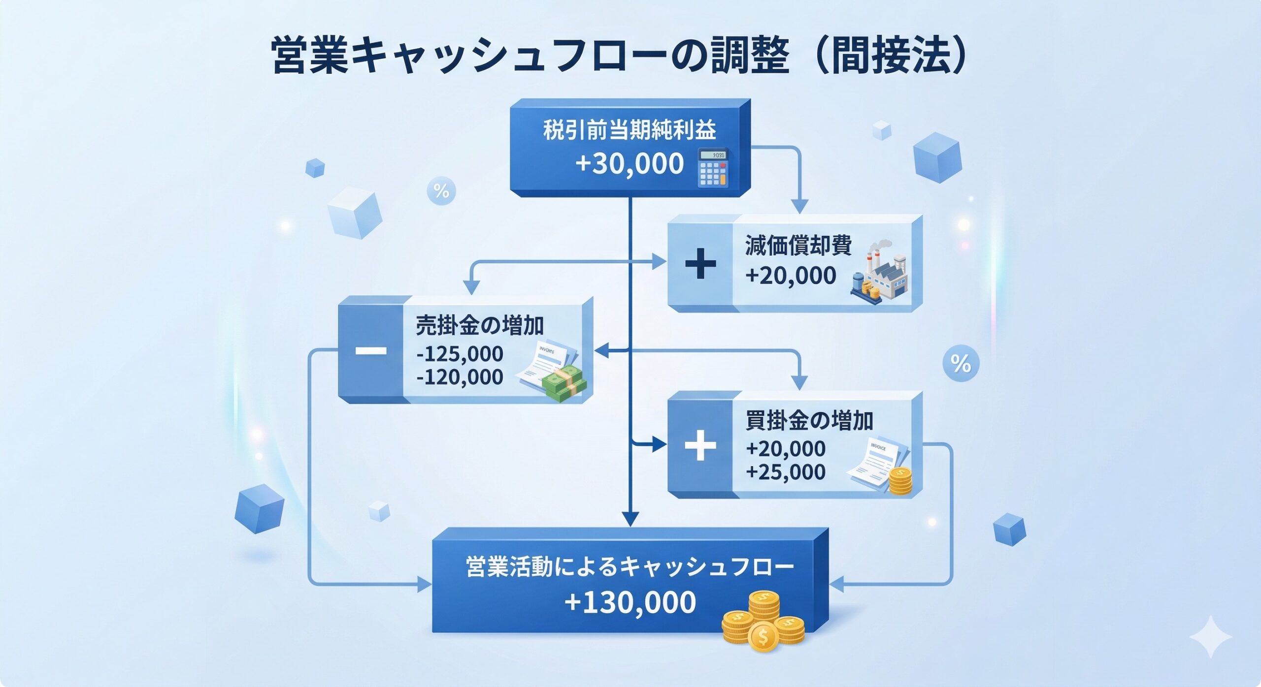 - のれん償却額の計上: 費用として利益を減らしているが、現金は出ていかないため「加算」します。