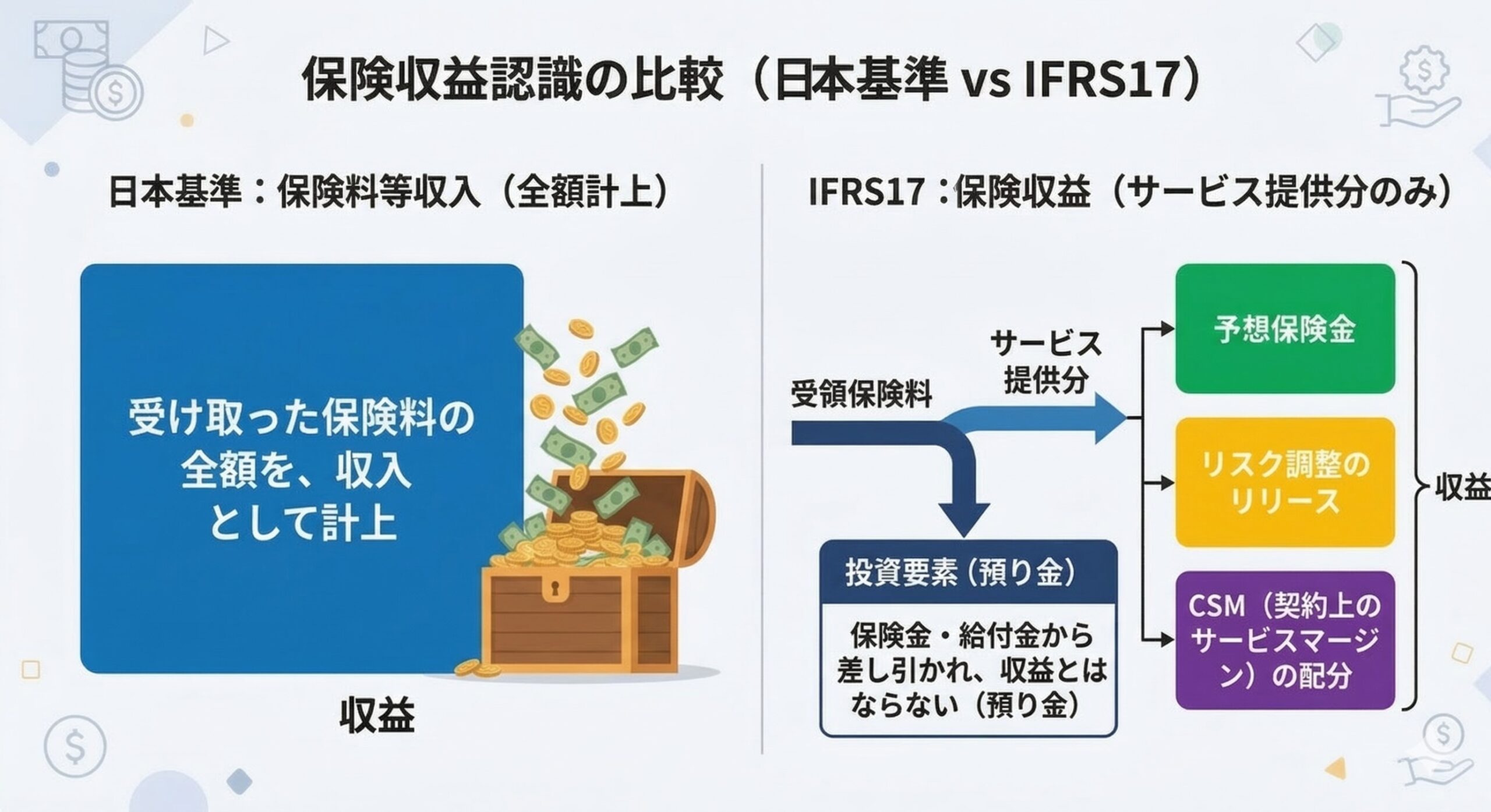 | 将来利益 | 負債内部に包含(非明示) | 契約上のサービスマージン(CSM) | 負債として明示され、将来利益が可視化。 |